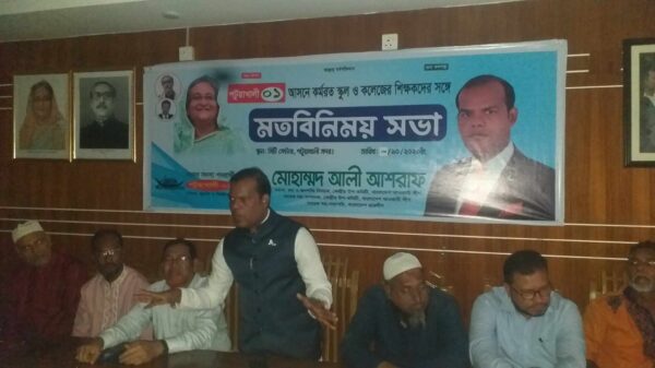 পটুয়াখালী ১ আসনে কর্মরত স্কুল ও কলেজের শিক্ষকদের সঙ্গে মতবিনিময় সভা করেন নৌকার মনোনয়ন প্রত্যাশী মোহাম্মদ আলী আরশাফ।