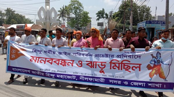নীলফামারীতে হিন্দু ধর্মীয় আইন পরিবর্তন প্রচেষ্টার প্রতিবাদে মানববন্ধন ও ঝাড়ুমিছিল অনুষ্ঠিত হয়,
